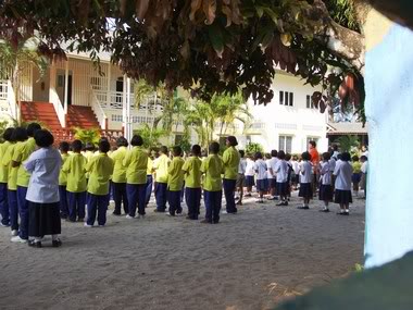 Så jeg gik tilbage til den skole der ligger til venstre for templet, alle børnene var samlet til morgensang og stod på også her i geled mens de skrålede med på Nationalsangen. Dejlige billeder af glade børn der har det godt, sneg jeg mig til at tage gennem betonmuren. Også her er der forskellige farver for piger og drenge, og for forskellige klassetrin.